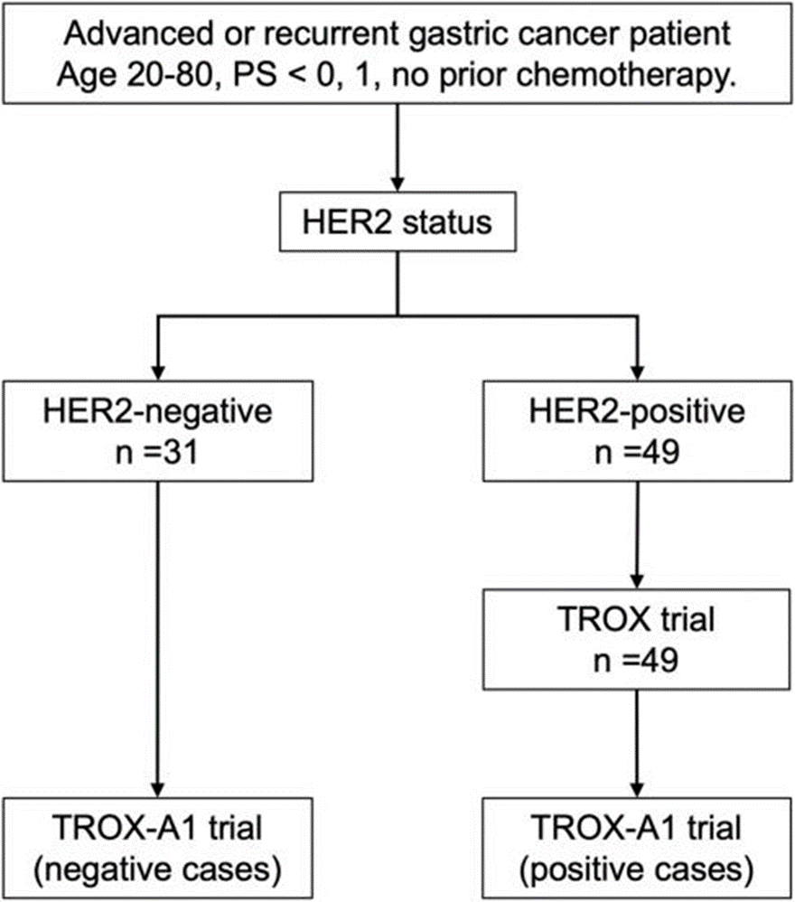 傳統(tǒng)意義上胃癌是指原發(fā)于胃的上皮源性惡性腫瘤。根據(jù)2022年匯總數(shù)據(jù),胃癌是全球發(fā)病率和死亡率第五的常見惡性腫瘤,發(fā)病率約為97萬/每年、死亡約為66萬/年[1]。人表皮生長因子受體2(HER2)是胃癌常見的重要靶點,大約12%-18%的胃癌患者會出現(xiàn)HER2過表達或基因擴增[2.3]。HER2陽性晚期胃癌一線治療中,曲妥珠單抗是抗HER2靶向治療的基石,對于PD-L1 CPS≥1患者,也可采取PD-1單抗+曲妥珠單抗+化療的聯(lián)合方案[4]。為了更深入地了解HER2陽性和陰性胃癌患者之間的基因特征差異,研究人員對TROX-A1試驗中80例HER2陽性和陰性胃癌患者的基因特征進行了深入分析,旨在探究HER2陽性和陰性胃癌患者可能影響腫瘤進展和治療反應的基因特征,從而為胃癌的個性化治療提供新的思路和方法。