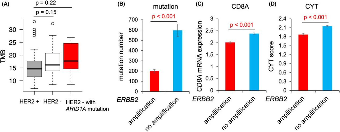 HER2陽性患者、HER2陰性患者和HER2陰性患者的TMB中值ARID1A突變分別為14.6、16.2和17.7。HER2陽性患者的TMB中值ARID1A突變率為16.2。在HER2陰性的胃癌患者中有較高TMB的趨勢,特別是在ARID1A突變患者中。