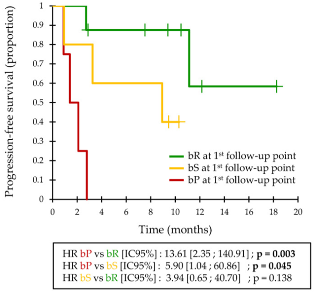 圖1.基于首次隨訪時ctDNA濃度變化的無進展生存期率(bP,ctDNA濃度上升;bR,ctDNA濃度下降;bS,ctDNA濃度變化平穩(wěn))
